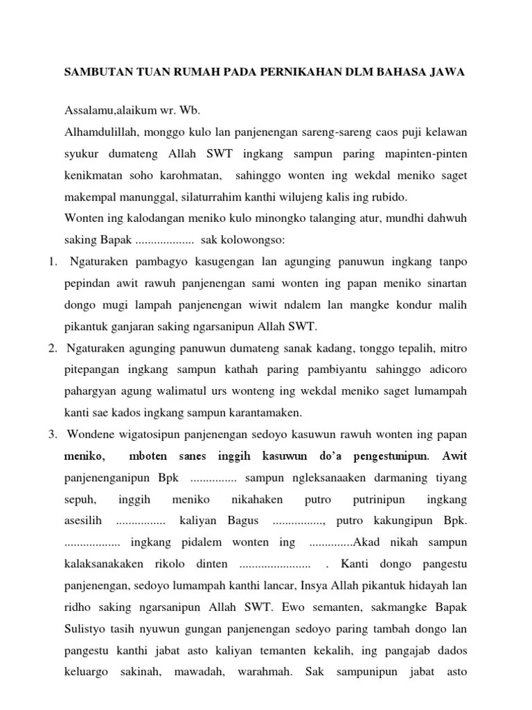 Dibawah ini adalah contoh pidato bahasa jawa karma dalam acara pernikahan, buat kamu yang sedang mencari pidato bahasa jawa untuk acara pernikahan bisa langsung membacanya di bawah ini. Jika kalian adalah wong jowo, pastinya teks mempersiapkan teks menjadi keharusan jika anda belum terbiasa. Acara rapat bersama untuk membahas persiapan pesta pernikahan di jawa sering disebut kumbokarnan, acara ini biasanya dilakukan dua minggu atau minimal satu minggu menjelang acara pernikahan dilangsungkan.semangat gotong royong tercemin dalam acara kumbokarnan ini, dari para remaja hingga yang tua saling berbagi tugas untuk mengemban tanggung jawab … Demikian contoh teks naskah untuk mc atau pembawa acara pengajian dalam bahasa jawa materi ini saya posting sebagai pengalaman saya untuk mempersiapkan materi ketika menjadi mc atau … Dec 20, 2021 · sambutan adalah jenis pidato yang disampaikan dalam rangka memberi sambutan pada sebuah acara.